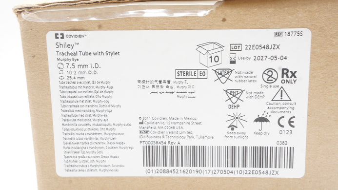 - Covidien 18775S Shiley Tracheal Tube W/Stylet 7.5ID x 10.2OD x 25.4mm- Box of 10