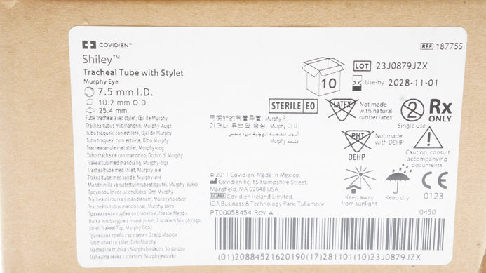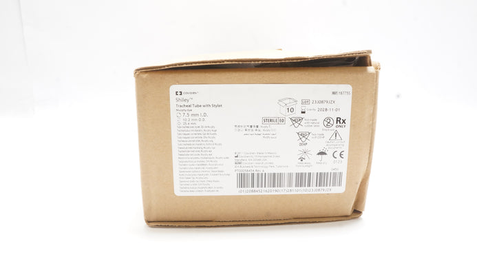- Covidien 18775S Shiley Tracheal Tube W/Stylet 7.5ID x 10.2OD x 25.4mm- Box of 10