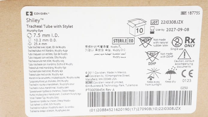 - Covidien 18775S Shiley Tracheal Tube W/Stylet 7.5ID x 10.2OD x 25.4mm- Box of 7