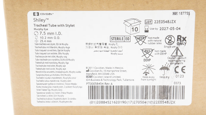- Covidien 18775S Shiley Tracheal Tube W/Stylet 7.5ID x 10.2OD x 25.4mm- Box of 9
