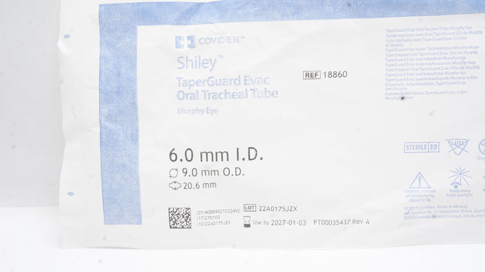 - Covidien 18860 Shiley TaperGuard Evac Oral Tracheal Tube 6.0ID x 9.0OD x 20.6mm