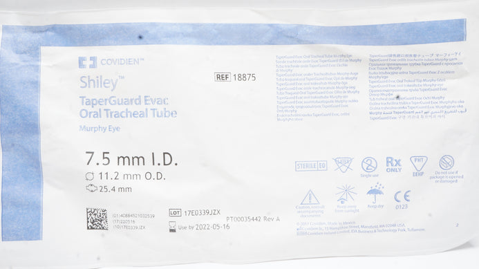 - Covidien 18875 Shiley TaperGuard Evac Oral Tracheal Tube 7.5IDx11.2ODx25.4mm (x)