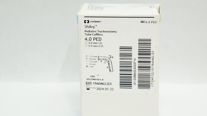 - Covidien 4.0PED Shiley Pediatric Tracheostomy Tube Cuffless 4mm ID x 5.9mm OD