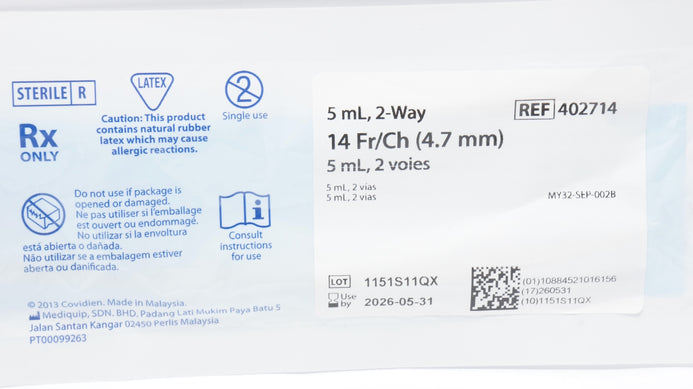 - Covidien 402714 Dover Silicone Elastomer Coated Foley Cath. 2 Way, 5ml, 14Fr/Ch