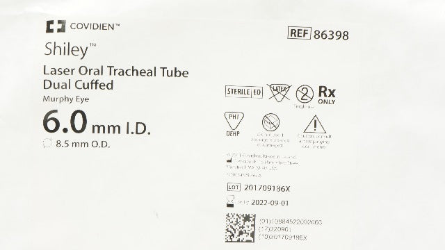 - Covidien 86398 Shiley Laser Oral Tracheal Tube Dual, Cuffed 6.0 ID x 8.5mm OD(x)