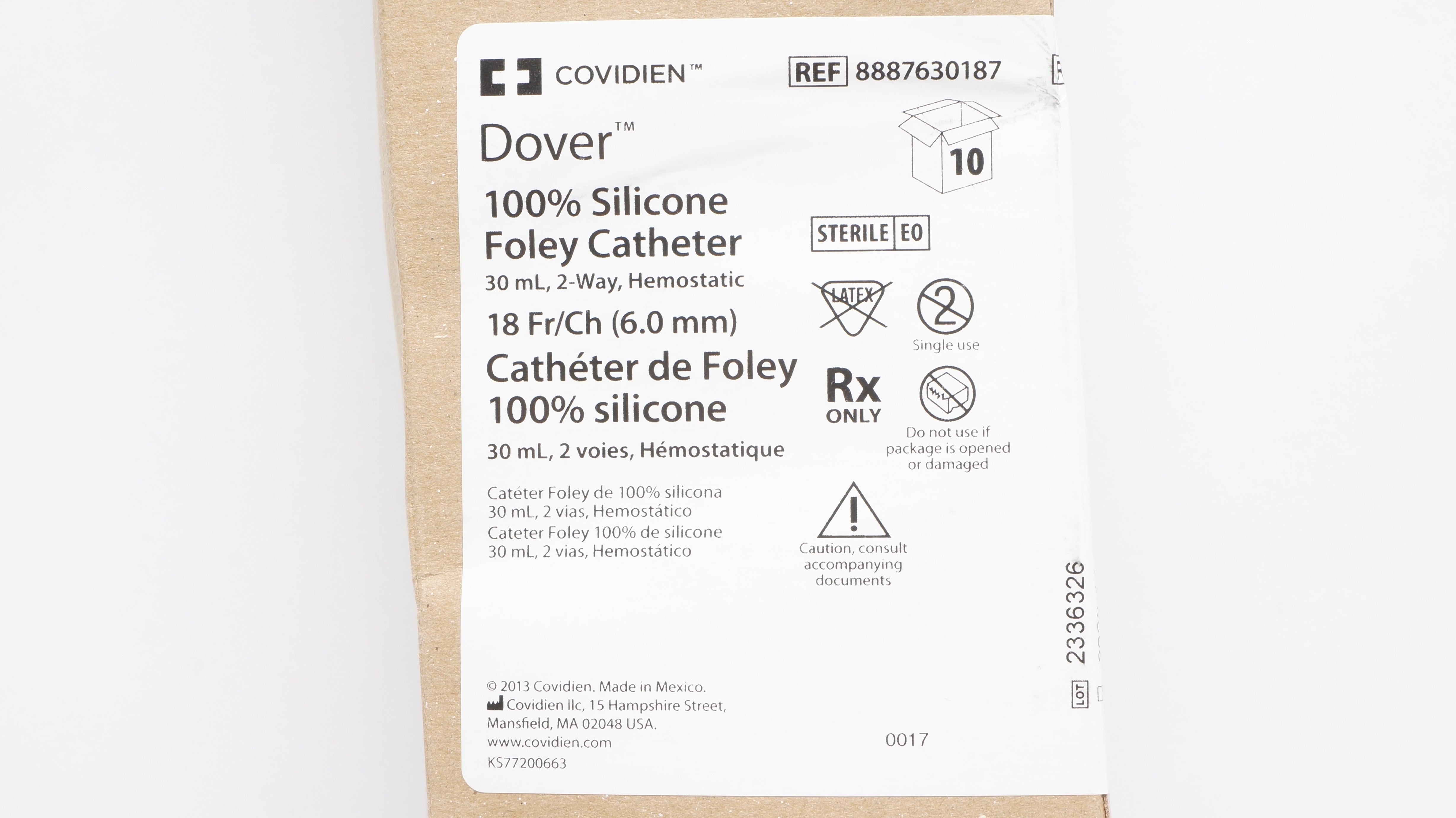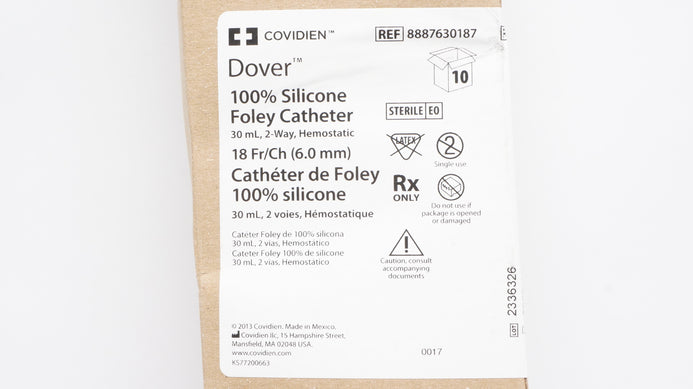 - Covidien 8887630187 Dover 100% Silicone Foley Cath.2-Way,18Fr/Ch 30ml -Box of 10