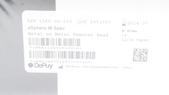 - Depuy 1365-06-100 aSphere M-Spec Femoral Head 40mm +5 12/14Taper (x)