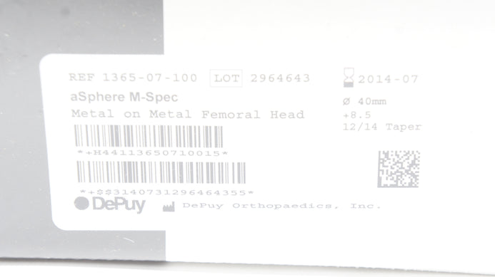 - DePuy 1365-07-100 aSphere M-Spec Metal on Metal Femoral Head 40mm,+8.5, 12/14(x)