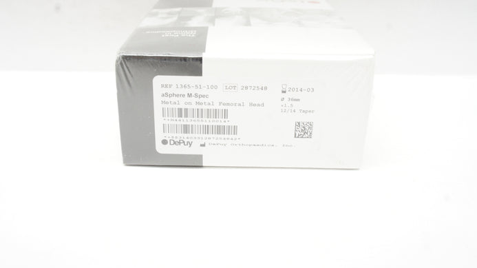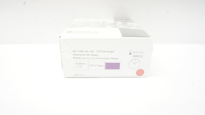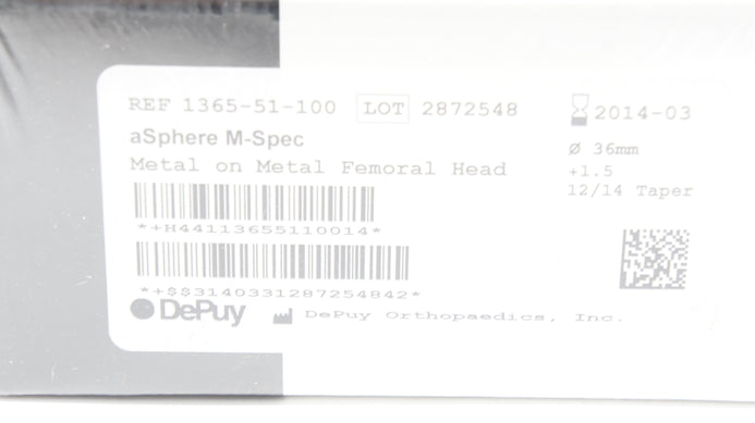 - DePuy 1365-51-100 aSphere M-Spec Metal on Metal Femoral Head 36mm,+1.5, 12/14(x)