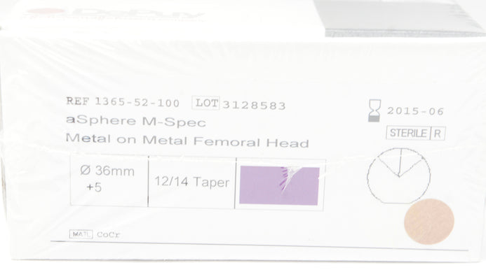 - DePuy 1365-52-100 Asphere M-Spec Metal, Femoral Head 36mm x 12/14 Tape ,+5 (x)