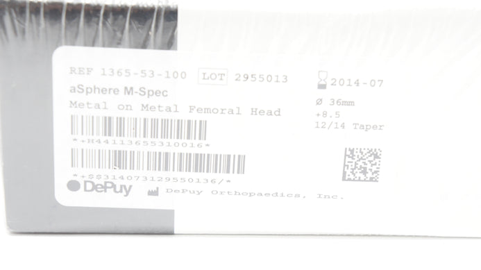 - DePuy 1365-53-100 aSphere M-Spec Metal on Metal Femoral Head 36mm,+8.5x 12/14(x)