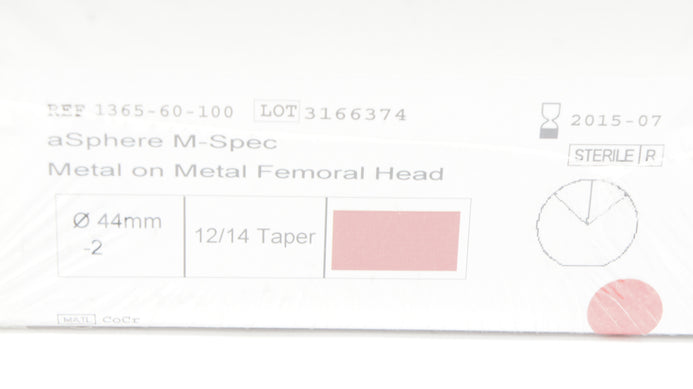 - DePuy 1365-60-100 aSphere M-SPec Metal on Metal Femoral Head 44mm x -2,12/14 (x)