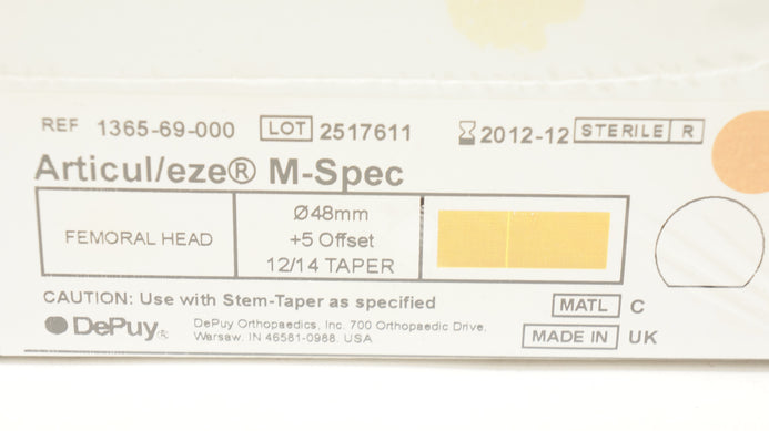 DePuy 1365-69-000 Articul/eze M-Spec Femoral Head 48mm +5 Offset 12/14 Taper (x) DePuy 1365-69-000 Articul/eze M-Spec Femoral Head 48mm +5 Offset 12/14 Taper (x) DePuy 1363-54-000 Modular Cathcart Fracture Head 54 mm OD