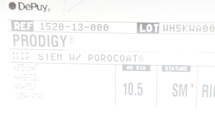 - DePuy 1520-13-000 Prodigy Hip Stem W/Porocoat SM, Right, 10.5mm