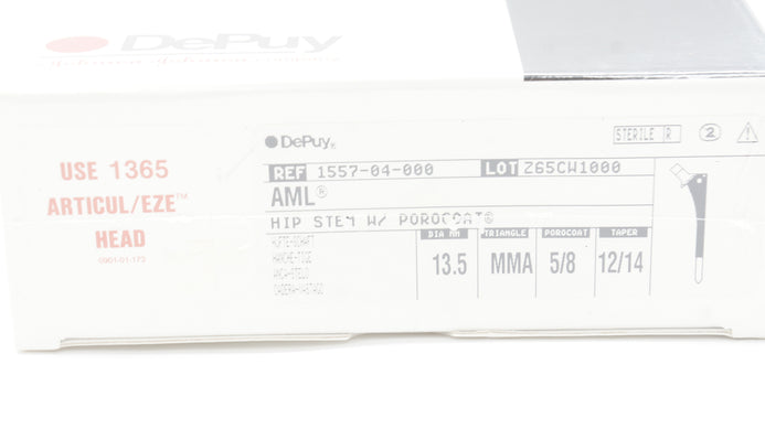 - DePuy 1557-04-000 AML Hip Stem W/Porocoat 13.5mm, MMA, 5/8, 12/14 Taper
