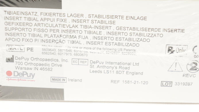 DePuy 1581-23-110 Tibial Insert Fixed Bearing Stabilized Size 3, 10mm, XLK (x) DePuy 1581-21-120 Sigma Cross Linked Stabilized Insert 20mm, Size 2 (x) DePuy 1581-21-120 Sigma Cross Linked Stabilized Insert 20mm, Size 2 (x)