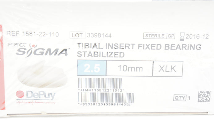 - DePuy 1581-22-110 Sigma Tibial Insert Fixed Bearing Stabilized 2.5, 10mm XLK (x)