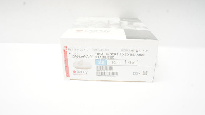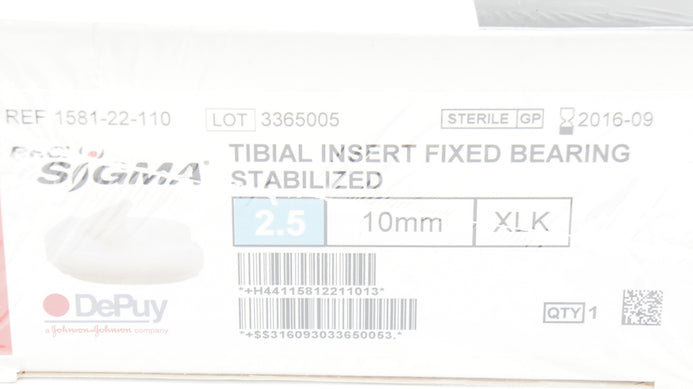 - DePuy 1581-22-110 Sigma Tibial Insert Fixed Bearing Stabilized 2.5, 10mm XLK (x)