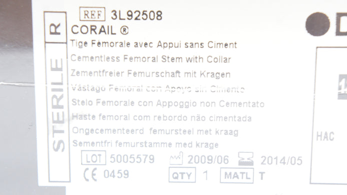 - DePuy 3L92508 Corail Cementless Femoral Stem w/Collar KA18, 12/14 AMT (x)