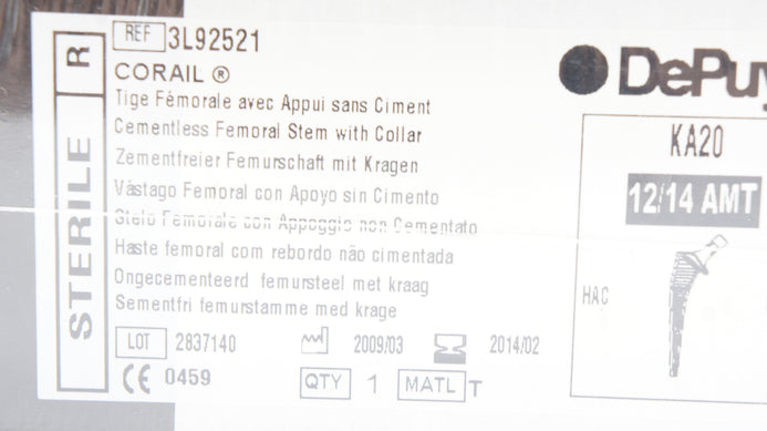 - DePuy 3L92521 KA20 Corail Cementless Femoral Stem w/Collar Size 20 (x)