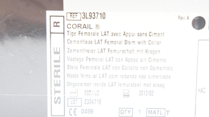 - DePuy 3L93710 CORAIL Cementless LAT Femoral Stem w/Collar, KLA 10, 12/14 AMT (x)