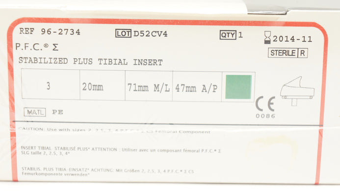 - DePuy 96-2734 Stabilized Plus Tibial Insert Size 3, 20mm x 71mmM/L x 47mmA/P (x)