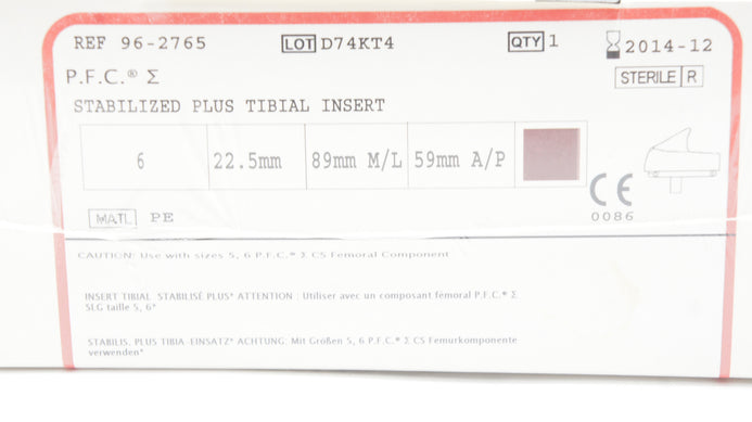 - DePuy 96-2765 Stabilized Plus Tibial Insert Size 6, 22.5mm, 89mm M/L, 59mm A/P
