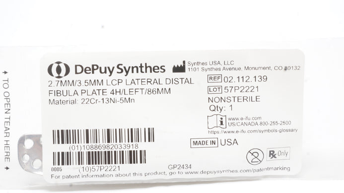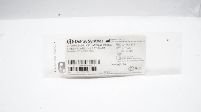 - DePuy Synthes 02.112.139 2.7/3.5mm LCP Lateral Distal Fibula Plate 4H/Left 86mm
