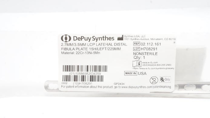 - DePuy Synthes 02.112.161 2.7/3.5mm LCP Lateral Distal Fibula Plate 15H/LT 229mm