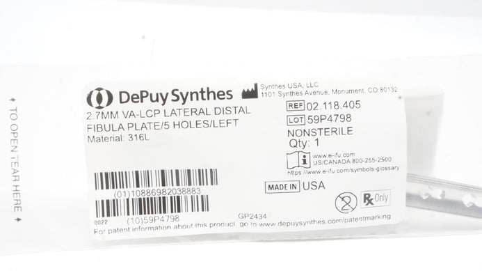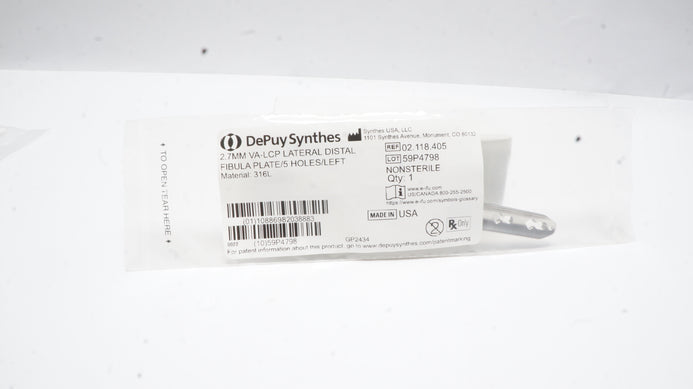 - Depuy Synthes 02.118.405 2.7mm VA-LCP Lateral Distal Fibula Plate/5Holes/Left