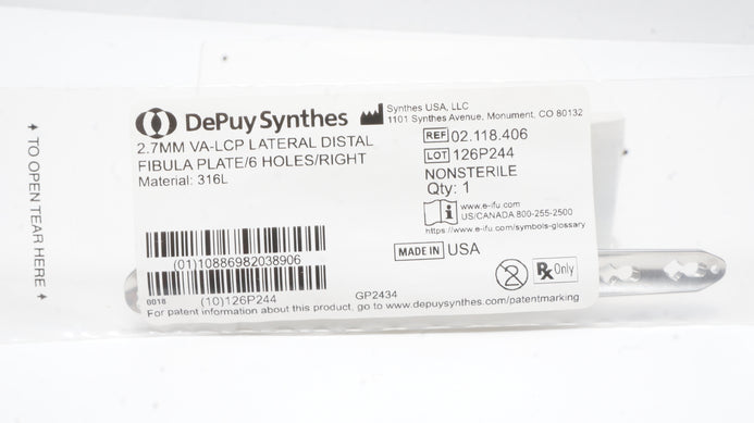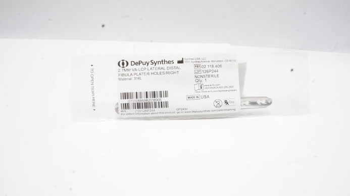 - DePuy Synthes 02.118.406 2.7mm VA-LCP Lateral Distal Fibula Plate/6Holes/Right