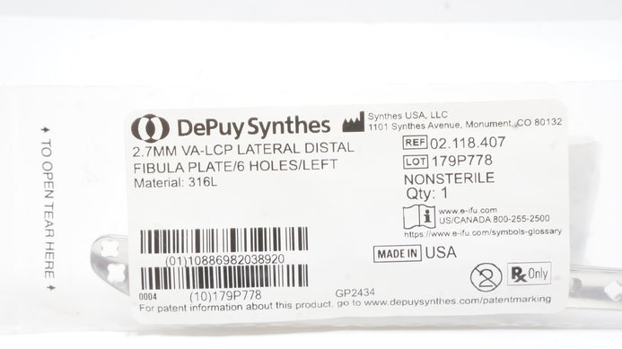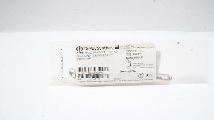 - DePuy Synthes 02.118.407 2.7mm VA-LCP Lateral Distal Fibula Palte/6Holes/Left