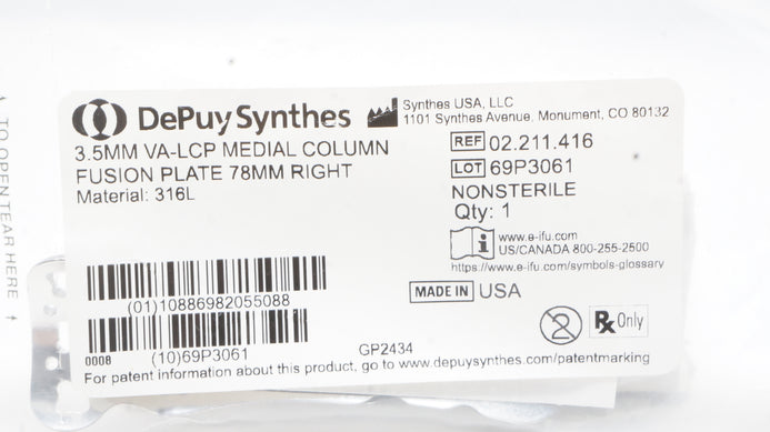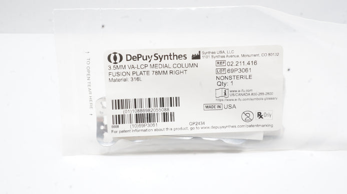 - DePuy Synthes 02.211.416 3.5mm VA-LCP Medial Column Fusion Palte 78mm Right