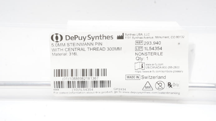 - DePuy Synthes 293.940 5.0mm Steimann Pin W/Central Thread 300mm
