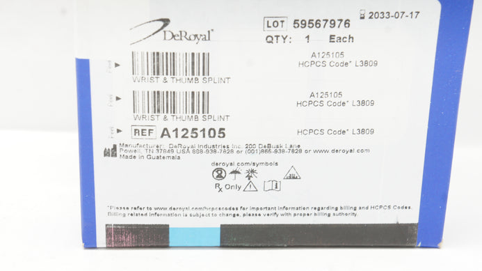- DeRoyal A125105 Wrist & Thumb Splint Small/Left
