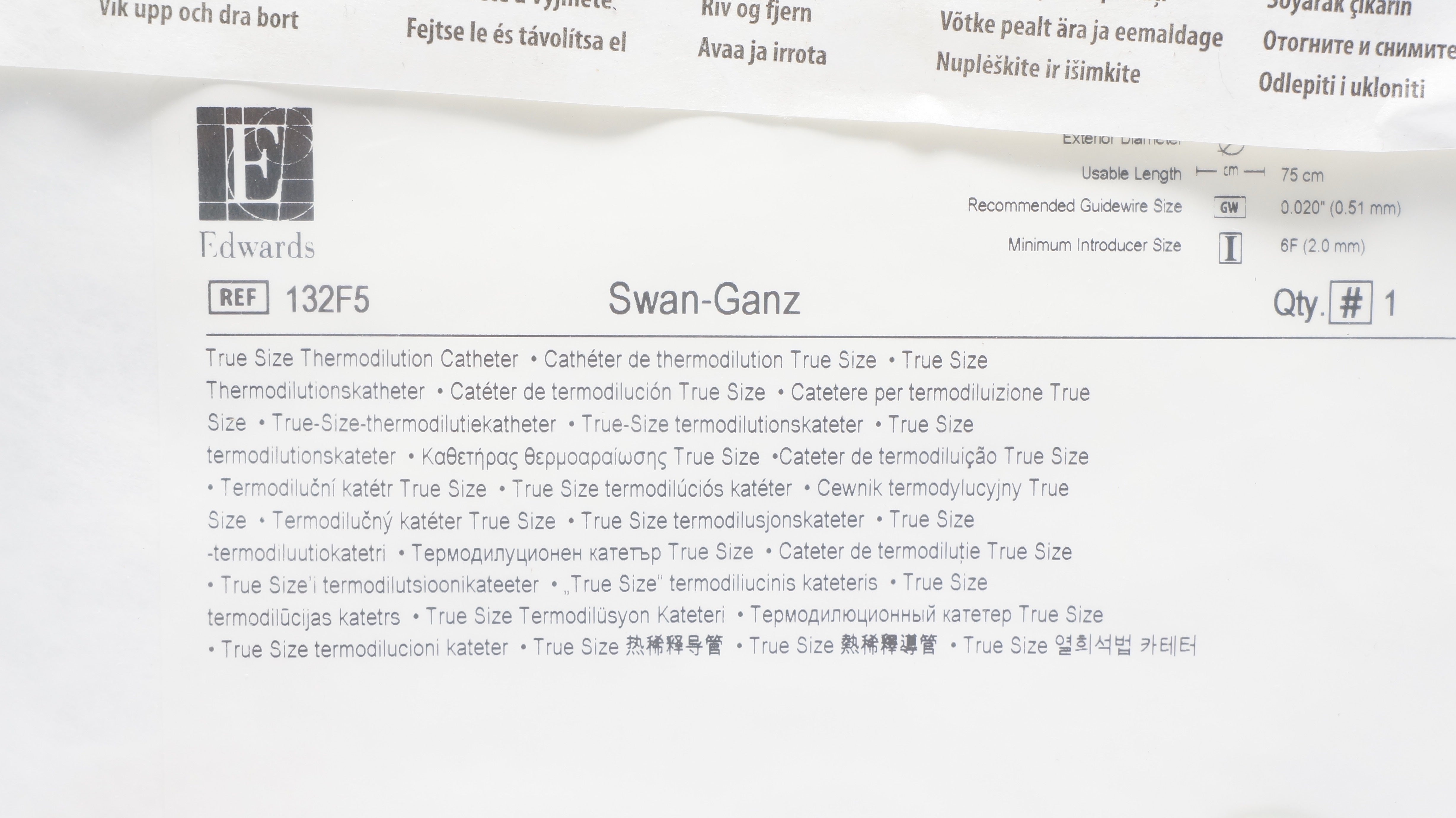 - Edwards Lifesciences 132F5 Swan-Ganz true Size Thermodilution Cath 5F 75cm