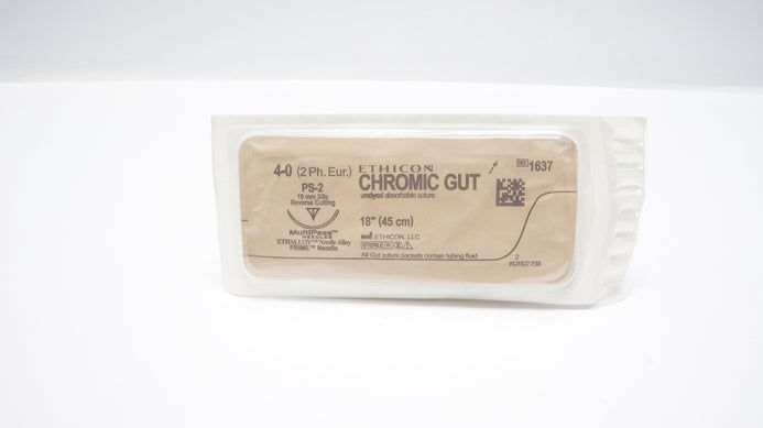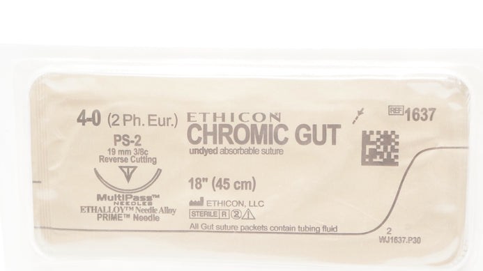 - Ethicon 1637 4-0 CHROMIC GUT, PS-2, 19mm 3/8c Reverse Cutting, 18inch (X)