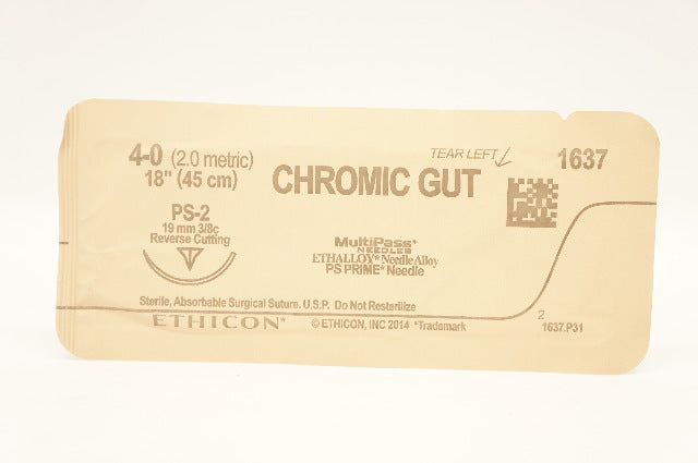 - Ethicon 1637 4-0 Chromic Gut Surgical Stre PS-2 19mm 3/8c Reverse Cutting 18inch