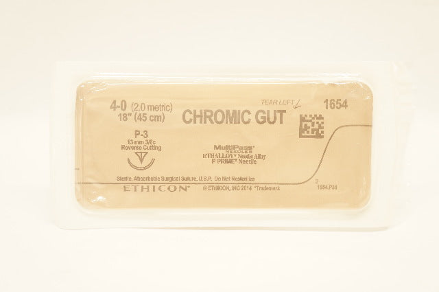 - Ethicon 1654 4-0 CHROMIC GUT P-3 13mm 3/8 Reverse Cutting, 18inch (x)