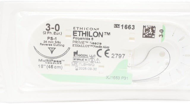 - Ethicon 1663 3-0 ETHILON Stre PS-1 24mm 3/8c Reverse Cutting, 18inch