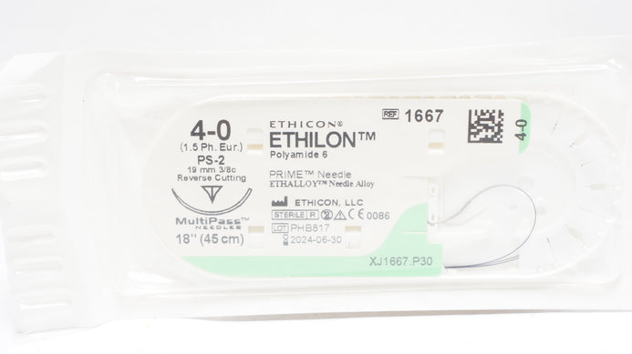 - Ethicon 1667 4-0 ETHILON Nylon Stre PS-2, 19mm 3/8c Reverse Cutting, 18inch (x)