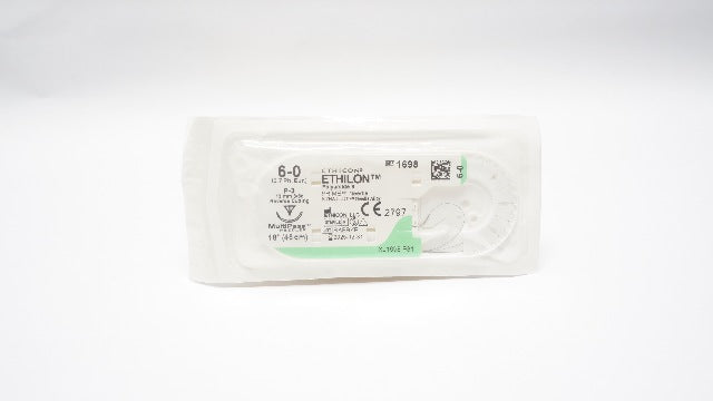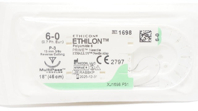 - Ethicon 1698 6-0 Ethilon Polyamide 6 Stre P-3 13mm 3/8c Reverse Cutting, 18inch