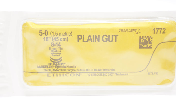 - Ethicon 1772 5-0 Plain Gut, S-14, 8mm 1/4c Sabreloc Spatula, 18inch