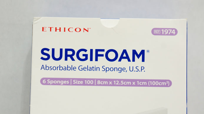- Ethicon 1974 SURGIFOAM Absorbable Gelatin Sponge 100, 8 x 12.5 x 1cm - Box of 6