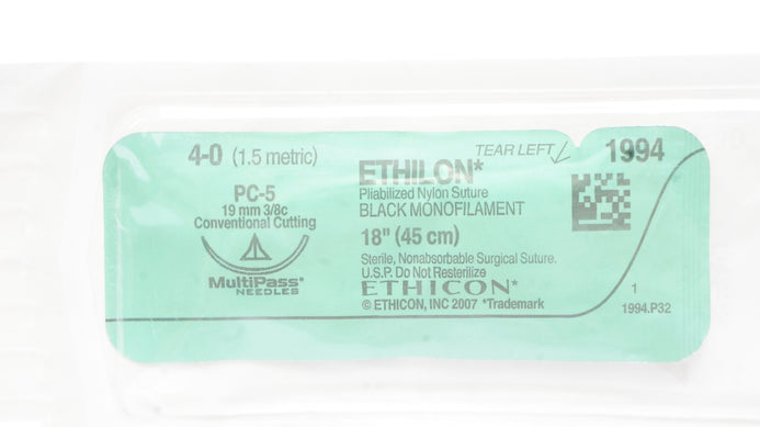 - Ethicon 1994 4-0 Ethilon Nylon Stre PC-5 19mm 3/8c Conventional Cutting, 18in(x)