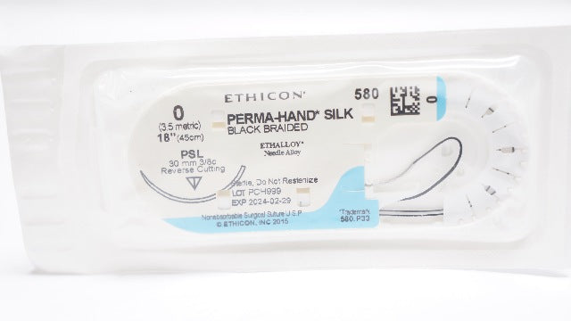 - Ethicon 580 0 Perma-Hand Silk Stre PSL 30mm 3/8c Reverse Cutting, 18inch (x)