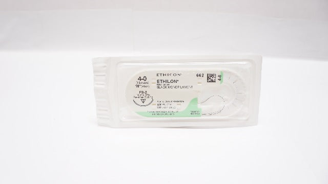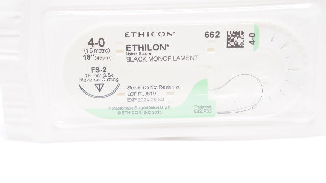 - Ethicon 662 4-0 ETHILON Nylon, FS-2, 19mm 3/8c Reverse Cutting, 18inch
