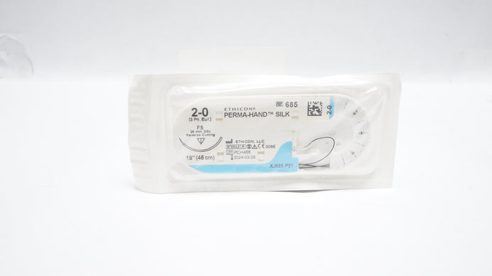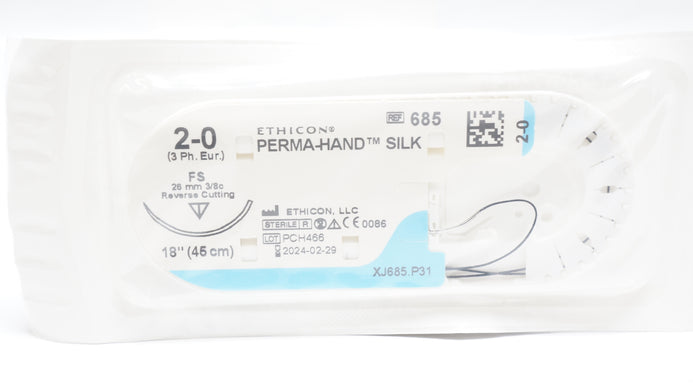- Ethicon 685 2-0 Perma-Hand Silk Stre FS 26mm 3/8c Reverse Cutting 18inch (x)