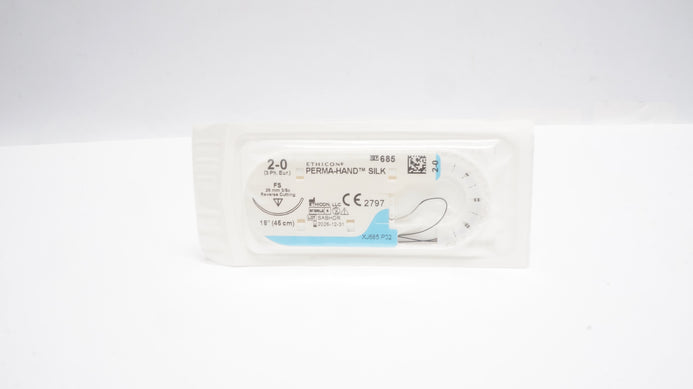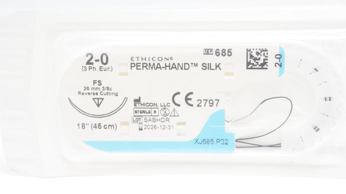 - Ethicon 685 2-0 Perma-Hand Silk Stre FS, 26mm 3/8c Reverse Cutting, 18inch (x)