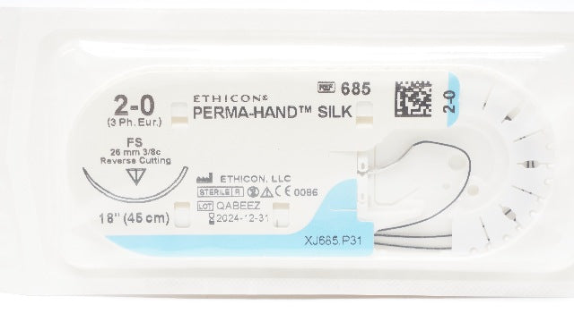 - Ethicon 685 2-0 Perma-Hand Silk Stre FS, 26mm 3/8c Reverse Cutting, 18inch (x)